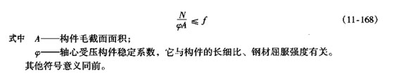 軸心受壓構(gòu)件的強(qiáng)度計(jì)算公式同軸心受拉構(gòu)件一樣,采用公式(11-166),但式中N為軸心壓力設(shè)計(jì)值,f為鋼材抗壓強(qiáng)度設(shè)計(jì)值。