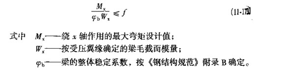 如圖11-94,梁在最大剛度平面內(nèi)彎曲(繞x軸彎曲),當(dāng)受壓翼緣的彎曲應(yīng)力達(dá)到某一值后,就會(huì)出現(xiàn)平面的彎曲和扭轉(zhuǎn),最后使梁迅速喪失承載力,這種現(xiàn)象稱梁?jiǎn)适дw穩(wěn)定。梁?jiǎn)适дw穩(wěn)定寸的荷載一般低于強(qiáng)度破壞時(shí)的荷載,且失穩(wěn)破壞是突然發(fā)生的,危害性大:因此,除計(jì)算梁的強(qiáng)度外,還必須驗(yàn)算其穩(wěn)定性,穩(wěn)定計(jì)算公式為: