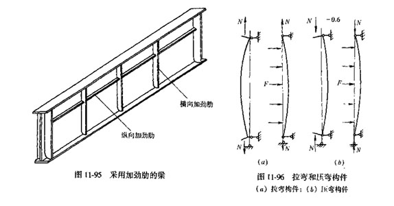 拉彎和壓彎構(gòu)件是指同時承受軸心拉力或軸心壓力及彎矩的構(gòu)件,也稱為偏心受拉或偏心受壓構(gòu)件。拉彎和壓彎構(gòu)件的彎矩可以由縱向荷載不通過構(gòu)件截面形心的偏心引起,也可由橫向荷載引起(圖11-96)。