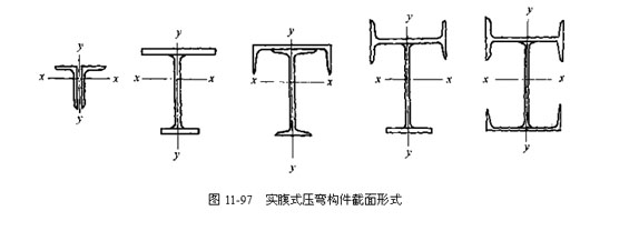 拉彎和壓彎構(gòu)件,當彎矩較小時,它們的截面形式與一般軸心受力構(gòu)件截面形式相同(圖11-96、圖11-97);當彎矩較大時,應(yīng)采用在彎矩作用平面內(nèi)高度較大的截面。對于壓彎構(gòu)件,如只有一個方向的彎矩較大時(如繞x軸的彎矩),可采用如圖11-97所示的單軸對稱的截面形式,并使較大翼緣位于受壓較大一側(cè)。