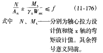 拉彎構(gòu)件的截面上,除有軸心拉力產(chǎn)生的拉應(yīng)力外,還有彎矩產(chǎn)生的彎曲應(yīng)力,構(gòu)件截面的應(yīng)力應(yīng)為兩者之和(圖11-98)。截面設(shè)計時,應(yīng)按截面上最大正應(yīng)力計算強度: