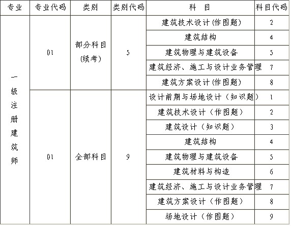 ?、?一級(jí)注冊(cè)建筑師執(zhí)業(yè)資格專業(yè)、類別、科目及代碼如下: