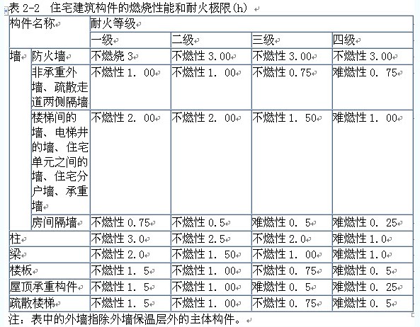 1.住宅建筑的耐火等級劃分為一、二、三、四級,其構(gòu)件的燃燒性能和耐火極限不低于表2-2的規(guī)定。