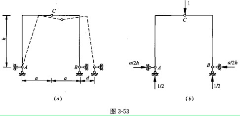 【例 3 -20 】 圖 3 -53 ( a )所示三鉸剛架,支座 B 發(fā)生了水平位移 d ,計算由此引起的鉸 C 的豎向位移。