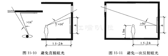 觀看展品時,窗口應處在視野范圍之外,從參觀者的眼睛到畫框邊緣和窗口邊緣的夾角要>14°。(圖15―10)。