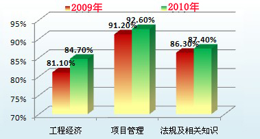 工程經(jīng)濟(jì)84.7%,項(xiàng)目管理92.6%, 法規(guī)87.4%, 建筑85.1%, 機(jī)電82.5%