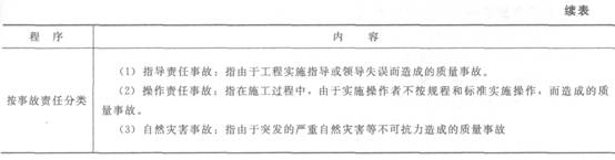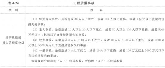 質(zhì)量不合格和質(zhì)量缺陷;質(zhì)量問(wèn)題和質(zhì)量事故;特別重大事故;重大事故;較大事故;一般事故;指導(dǎo)責(zé)任事故;操作責(zé)任事故;自然災(zāi)害事故。