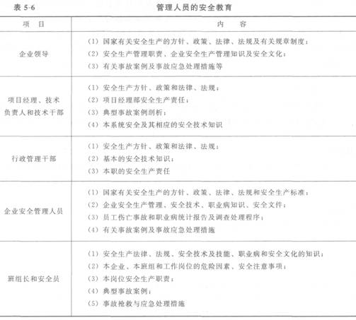企業(yè)領(lǐng)導的安全教育;項目經(jīng)理、技術(shù)負責人和技術(shù)干部的安全教育;班組長和安全員的安全教育;特種作業(yè)的范圍;企業(yè)(公司)級安全教育由企業(yè)主管領(lǐng)導負責;安全思想、安全態(tài)度教育。