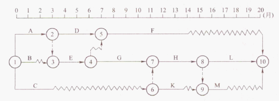 (4)此時(shí),線路G―H―L工期縮減至10個(gè)月;工作F線路自由時(shí)差為6個(gè)月,壓縮4個(gè)月后仍不會(huì)成為關(guān)鍵線路;線路G―H―M工期相應(yīng)縮減至3+(2+2)=7,也不會(huì)成為關(guān)鍵線路,故此時(shí)的關(guān)鍵線路仍為G―H―L,整個(gè)工程總工期為6+10=16個(gè)月,正好彌補(bǔ)施工初期4個(gè)月的工期滯后,可滿足業(yè)主提出的按原計(jì)劃日期竣工的要求。