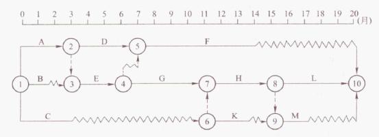 (4)此時,線路G―H―L工期縮減至10個月;工作F線路自由時差為6個月,壓縮4個月后仍不會成為關鍵線路;線路G―H―M工期相應縮減至3+(2+2)=7,也不會成為關鍵線路,故此時的關鍵線路仍為G―H―L,整個工程總工期為6+10=16個月,正好彌補施工初期4個月的工期滯后,可滿足業(yè)主提出的按原計劃日期竣工的要求。