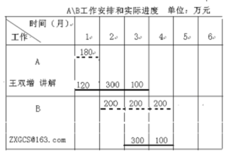4. 如果A\B工作安排如下圖。虛線和數(shù)字表示擬完工作計劃投資,實線和數(shù)字表示已完工作實際投資。兩個工作的工程量沒有變化,合同價格也沒有變化。請用點劃線補畫出已完工作計劃投資橫道圖,并標出金額。