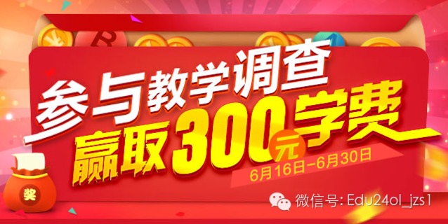 參與方式:在活動頁面注冊新用戶名,注冊成功后,回答有關(guān)教學(xué)的調(diào)查問卷,即可獲取300元學(xué)費,學(xué)費會在提交問卷后自動存到您的用戶中心。
