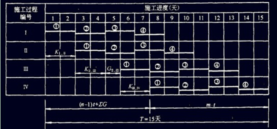 Tp=ΣKi+Σtn,式中ΣKi為各流水步距之和,Σtn為最后一個(gè)施工過(guò)程在各施工段的持續(xù)時(shí)間之和。