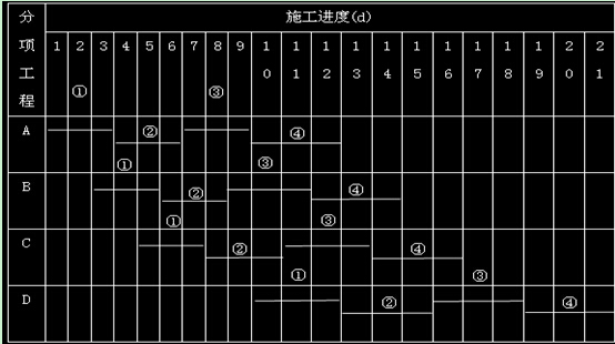 (2)組織無(wú)節(jié)奏流水施工并繪制流水施工計(jì)劃?rùn)M道圖。