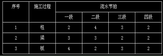 某工程由主樓和塔樓組成,現(xiàn)澆鋼筋混凝土柱,預(yù)制梁板,框架-剪力墻結(jié)構(gòu)。工程擬分成四段進(jìn)行流水施工,各段流水節(jié)拍見(jiàn)下表。