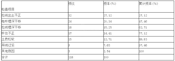 對(duì)某架空線路工程質(zhì)量問題的調(diào)查,發(fā)現(xiàn)導(dǎo)致桿歪的原因有:電桿埋深不夠24處,拉線出土不正32處,拉線埋深不夠18處,土質(zhì)松軟15處,吊線過緊9處,桿位不正17處,其他原因3處。