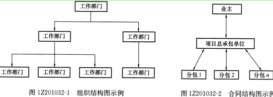 組織論的三個(gè)重要的組織工具,項(xiàng)目結(jié)構(gòu)圖、組織結(jié)構(gòu)圖和合同結(jié)構(gòu)圖(如圖1.Z201032-2所示)的區(qū)別見表1Z201032。