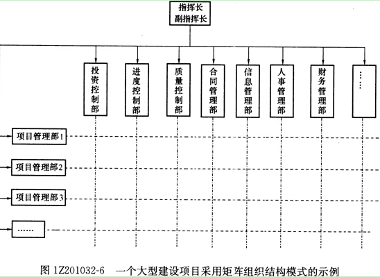 一個(gè)大型建設(shè)項(xiàng)目如采用矩陣組織結(jié)構(gòu)模式,則縱向工作部門可以是投資控制、進(jìn)度控制、質(zhì)量控制、合同管理、信息管理、人事管理、財(cái)務(wù)管理和物資管理等部門,而橫向工作部門可以是各子項(xiàng)目的項(xiàng)目管理部(如圖1Z201032-6所示)。矩陣組織結(jié)構(gòu)適宜用于大的組織系統(tǒng),在上海地鐵和廣州地鐵一號線建設(shè)時(shí)都采用了矩陣組織結(jié)構(gòu)模式。