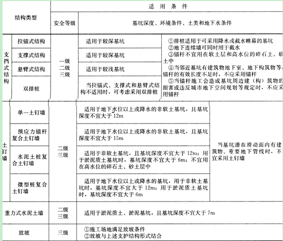 (4)明挖法基坑支護結(jié)構(gòu)選擇時,應(yīng)綜合考慮基坑周邊環(huán)境和地質(zhì)條件的復(fù)雜程度,首先確定基坑安全等級,然后根據(jù)等級選用基坑支護結(jié)構(gòu)。 《建筑基坑支護技術(shù)規(guī)程》JGJ120―2012的基坑支護結(jié)構(gòu)安全等級劃分見表1K413011-2;對于同一基坑的不同位置,可采用不同的安全等級。依據(jù)該等級,基坑支護結(jié)構(gòu)按1K413011-3選型。地鐵車站基坑形式與建筑基坑有所差異,但可參考《建筑基坑支護技術(shù)規(guī)程》進行基坑設(shè)計和施工。
