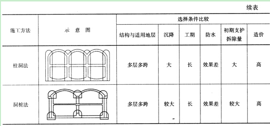 (2)上述不同掘進(開挖)方式與選擇考慮主要條件如表1K413041所示,以供工程實踐中參考。