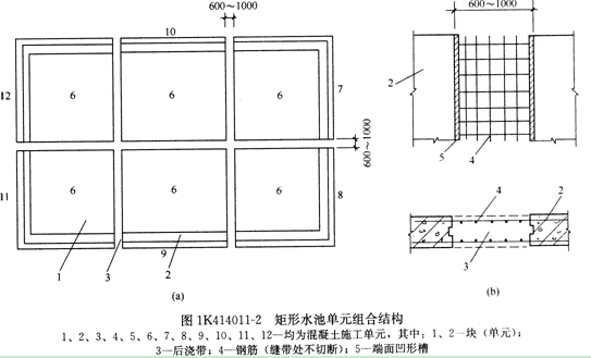 元)澆筑。各塊(單元)間留設(shè)后澆縫帶,池體鋼筋按設(shè)計要求一次綁扎好,縫帶處不切斷,待塊(單元)養(yǎng)護(hù)42d后,再采用比塊(單元)強(qiáng)度高一個等級的混凝土或摻加切認(rèn)的補(bǔ)償收縮混凝土灌筑后澆縫帶使其連成整體。如圖1K414011-2所示。