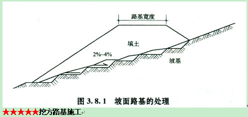 6.當(dāng)路堤基底橫坡陡于1:5時(shí),基底坡面應(yīng)挖成臺(tái)階,或設(shè)置成坡度向內(nèi)并大于4%、寬度大于2m臺(tái)階,并予以夯實(shí)。