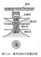 當(dāng)路基附近的地面水或淺層地下水無法排除,影響路基穩(wěn)定時(shí),可設(shè)置滲井,將地面水或地下水經(jīng)滲井通過下透水層中的鉆孔流人下層透水層中排除。