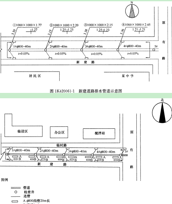 某公司中標承建開發(fā)區(qū)新建主干路含雨水管道工程,新建主干路全長1.85km,與現(xiàn)況外環(huán)(原有路)垂直相接,為已初具規(guī)模的開發(fā)區(qū)打通通向市區(qū)的交通(如圖1K420061-1所示)。該路段現(xiàn)況系碎石土路,主要是運輸物資汽車通行。新建雨水管采用柔性接口鋼筋混凝土管,管徑DN400~DN800,位于路中,沿路敷設(shè),管頂最小埋深3m,管道基礎(chǔ)采用碎石料換填(300mm)處理?,F(xiàn)況路南是已建居民區(qū),距丁字路口處為某中學,建有圍墻;現(xiàn)況路北為待拆移的散落平房和綠地;距丁字路口有一段菜田。
