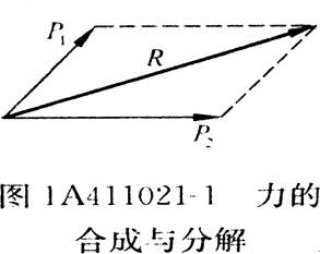 作用在物體上的兩個(gè)力用一個(gè)力來代替稱力的合成。力可以用線段表示,線段長短表示力的大小,起點(diǎn)表示作用點(diǎn),箭頭表示力的作用方向。力的合成可用平行四邊形法則,見圖1A41102-1,P1與P2合成R 。利用平行四邊形法則也可將一個(gè)力分解為兩個(gè)力,