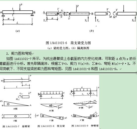 圖1A411021-6為一簡支梁。梁受彎后,上部受壓,產(chǎn)生壓縮變形;下部受拉,產(chǎn)生拉伸變形。 V為1-1截面的剪力,∑Y=0,V=YA 。1-1截面上有一拉力N和一壓力N,形成一力偶M,此力偶稱1―1截面的彎矩。根據(jù)∑M0=O,可求得M=YA?a。梁的截面上有兩種內(nèi)力,即彎矩M和剪力V 。