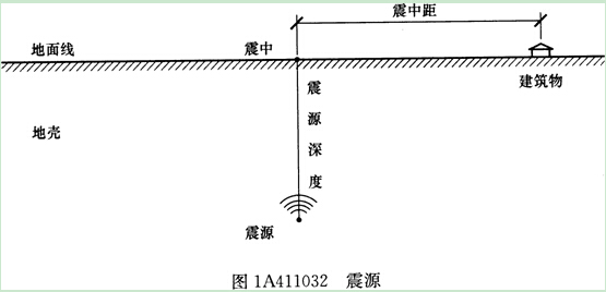 地殼深處發(fā)生巖層斷裂、錯動的部位稱震源。震源正上方的地方位置叫震中。震中附近地面震動最厲害,也是破壞最嚴(yán)重的地區(qū),稱為震中區(qū)。地面某處至震中的水平距離稱為震中距。震中至震源的垂直距離稱為震源深度。如圖1A411032所示。