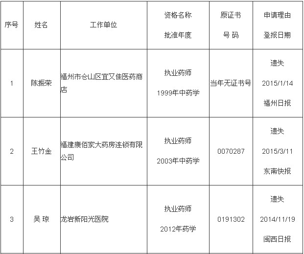 根據(jù)《關(guān)于更換補(bǔ)發(fā)專(zhuān)業(yè)技術(shù)資格證書(shū)有關(guān)問(wèn)題的通知》,擬為陳振榮等十五位同志申請(qǐng)補(bǔ)辦專(zhuān)業(yè)技術(shù)資格證書(shū),現(xiàn)予以公示。公示期間,如有異議,請(qǐng)及時(shí)向福建省人力資源和社會(huì)保障廳事業(yè)單位人事管理處反映。