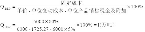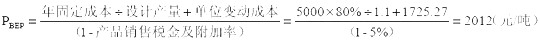 單位變動(dòng)成本=(總成本-固定成本)/設(shè)計(jì)產(chǎn)量=(5897.8-5000×80%)/1.1=1725.27(元/噸)