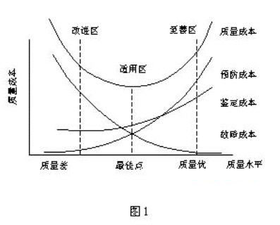 從圖1中可見(jiàn)質(zhì)量成本分為3個(gè)區(qū):①質(zhì)量改進(jìn)區(qū)是故障成本占主導(dǎo)地位的區(qū)域,它是影響達(dá)到最佳質(zhì)量成本的主導(dǎo)因素。質(zhì)量管理工作的重點(diǎn)在于加強(qiáng)質(zhì)量預(yù)防措施,加強(qiáng)質(zhì)量檢驗(yàn),提高質(zhì)量水平,降低質(zhì)量總成本;②質(zhì)量至善區(qū),表明控制成本占主導(dǎo)地位,它是影響質(zhì)量總成本達(dá)到最佳值的主要因素。質(zhì)量管理的重點(diǎn)在于分析現(xiàn)有的質(zhì)量標(biāo)準(zhǔn),減少檢驗(yàn)程序和提高工作效率,使質(zhì)量總成本降至較低水平;③質(zhì)量適用區(qū),質(zhì)量成本最低,說(shuō)明質(zhì)量標(biāo)準(zhǔn)比較適宜,是合適的質(zhì)量成本。
