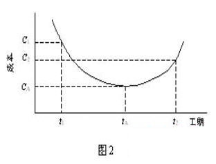 圖2中,tA為合理工期。在合理工期下,項(xiàng)目成本支出較低。工期比合理工期提前(t1)或拖后(t2)都意味著工程成本的提高。因此,在安排工期時(shí),要注意處理工期與成本的辯證統(tǒng)一關(guān)系,均衡有節(jié)奏地進(jìn)行施工,以求在合理使用資源的前提下,保證工期,降低成本。