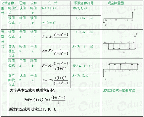 重點提示:這六個公式非常重要,前面說過可以簡化為一個公式,另外一點更要強調(diào)的是:每個公式必須對應(yīng)相應(yīng)的現(xiàn)金流量圖,不能有任何不一樣的地方,如果不一樣,就一定要先折算為一樣的才能應(yīng)用這六個基本公式。