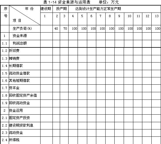 (4)按照表1-12給定的格式填寫項目的資金來源與運用表(表1-14),可根據(jù)需要設置其他短期借款,借款期為一年,按年末借款考慮,年利率10%。(注:該項貸款產(chǎn)生的利息可直接隨本金償還,不需考慮其對利潤總額的影響。)