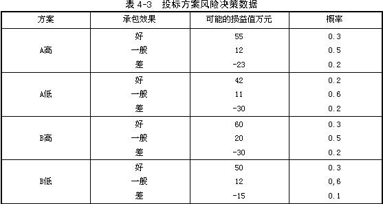 某施工公司欲在A、B兩項公開招標(biāo)工程中選擇一項進(jìn)行投標(biāo),對某項工程又可采取投高標(biāo)或投低標(biāo)兩種策略。根據(jù)以往經(jīng)驗與統(tǒng)計資料,若投高標(biāo),中標(biāo)的概率為0.3;若投低標(biāo),中標(biāo)的概率為0.5。各方案可能出現(xiàn)的損益值及其概率估計見表4-3。不中標(biāo)的費(fèi)用損失為5 000元。
