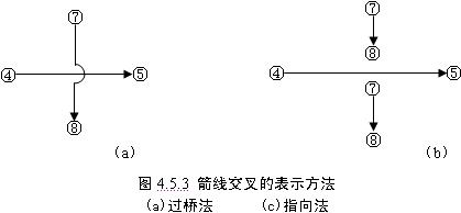 7)應(yīng)盡量避免網(wǎng)絡(luò)圖中工作箭線的交叉。當(dāng)交叉不可避免時,可以采用過橋法或指向法處理。如圖4.5.3所示。