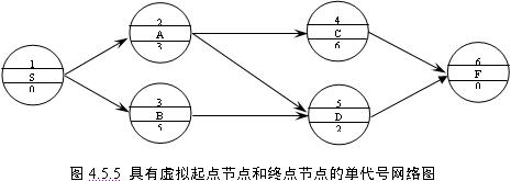 當(dāng)網(wǎng)絡(luò)圖中有多項開始工作時,應(yīng)增設(shè)一項虛擬的工作(S),作為該網(wǎng)絡(luò)圖的起點節(jié)點;當(dāng)網(wǎng)絡(luò)圖中有多項結(jié)束工作時,應(yīng)增設(shè)一項虛擬的工作(F),作為該網(wǎng)絡(luò)圖的終點節(jié)點。如圖4.5.5所示,其中S和F為虛擬工作。