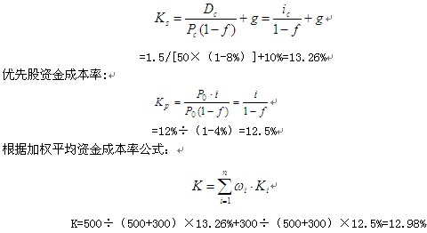 拓展:除了應(yīng)掌握股票的資金成本率的計算公式之外,考生還應(yīng)重點(diǎn)理解發(fā)行債券的資金成本率的計算公式,也可能是某一個企業(yè)同時發(fā)行股票和債券,計算其加權(quán)平均資金成本率。