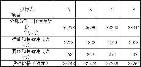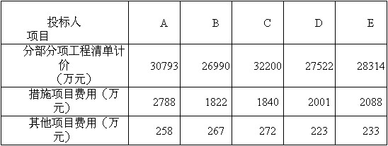 某市一項(xiàng)重點(diǎn)工程,采用工程量清單方式公開招標(biāo)。招標(biāo)文件中附有該項(xiàng)目土建工程工程量清單,要求投標(biāo)人根據(jù)本企業(yè)能力確定直接工程費(fèi)、措施費(fèi)、管理費(fèi)率、利潤(rùn)率(規(guī)費(fèi)費(fèi)率為5%,稅率3.41%)。經(jīng)資格審定后確定的合格投標(biāo)人名單包括A、B、C、D、E等5家資信和能力符合要求的施工企業(yè)。各投標(biāo)人按技術(shù)標(biāo)、商務(wù)標(biāo)分別裝訂報(bào)送投標(biāo)文件。