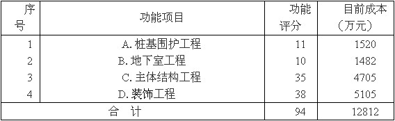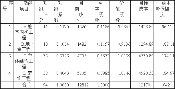 其他項目分析同理按功能系數(shù)計算目標成本及成本降低幅度,計算結果如下表。