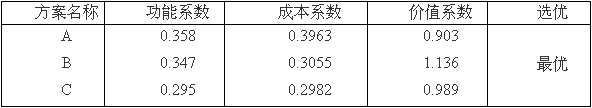 根據(jù)對A、B、C方案進行價值工程分析,B方案價值系數(shù)最高,為最優(yōu)方案。
