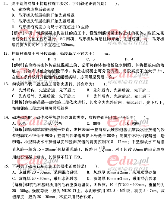 摘要 2012年造價工程師《技術(shù)與計量》(土建)過關(guān)必做試題及答案(十)主要內(nèi)容為第四章:工程施工技術(shù),第三節(jié):砌筑工程施工,單項選擇題、多項選擇題以及答案解析。