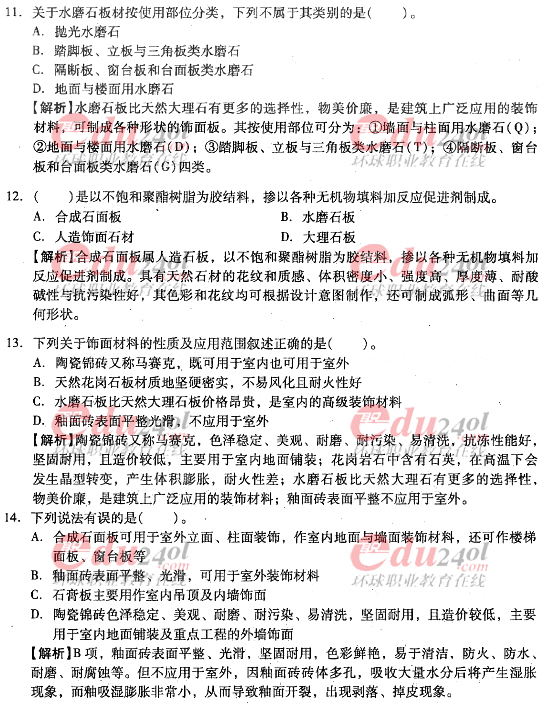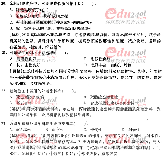 摘要 2012年造價(jià)工程師《技術(shù)與計(jì)量》(土建)過(guò)關(guān)必做試題及答案(七)主要內(nèi)容為第三章工程材料,第三節(jié):裝飾材料;第四節(jié):防水材料,單項(xiàng)選擇題、多項(xiàng)選擇題以及答案解析。