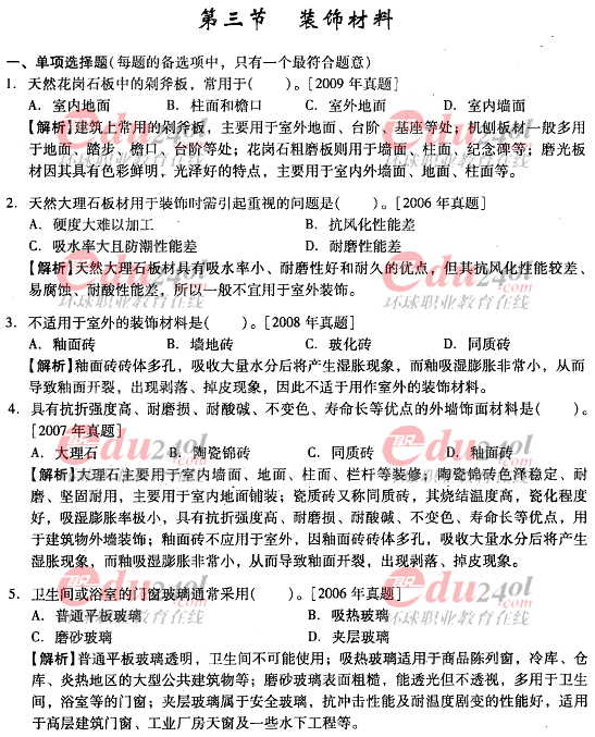 摘要 2012年造價工程師《技術(shù)與計量》(土建)過關(guān)必做試題及答案(七)主要內(nèi)容為第三章工程材料,第三節(jié):裝飾材料;第四節(jié):防水材料,單項選擇題、多項選擇題以及答案解析。