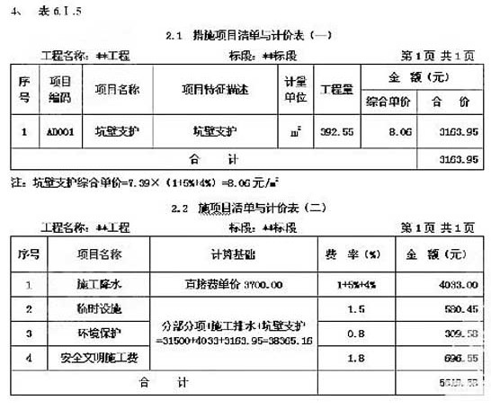 (1)編制挖基礎(chǔ)土方的措施項(xiàng)目清單計(jì)價(jià)表(一)、(二),填入答題紙表6.1.4“措施項(xiàng)目清單與計(jì)價(jià)表(一)、(二)”中。并計(jì)算其措施項(xiàng)目費(fèi)合計(jì)。