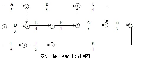 某工程合同工期21天,工程公司項(xiàng)目經(jīng)理部技術(shù)人員擬定的初始網(wǎng)絡(luò)進(jìn)度計(jì)劃如圖2-1所示。在公司協(xié)調(diào)會(huì)上,設(shè)備供應(yīng)部門提出,工作F、J使用的同種機(jī)械只能租賃到1臺(tái),因此,該兩項(xiàng)工作只能按先后順序施工。