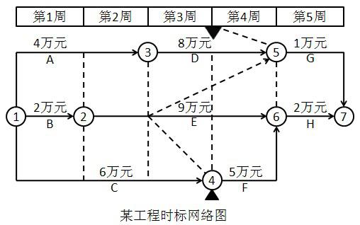 95.某工種有A至H共8項(xiàng)工作,計(jì)劃5周完成,時(shí)標(biāo)網(wǎng)絡(luò)圖如圖所示,各工作的計(jì)劃投資已標(biāo)注在箭線上,如A工作計(jì)劃投資4萬(wàn)元,黑三角符號(hào)所在的虛線為實(shí)際進(jìn)度前鋒線。則采用時(shí)標(biāo)網(wǎng)絡(luò)圖法進(jìn)行偏差分析的分析結(jié)果中,正確的有( )。